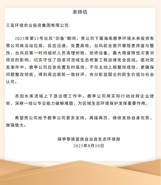 表揚信中高度贊揚了鹿亭公司用實際行動詮釋企業(yè)使命,深耕水務(wù)環(huán)保一線,以專業(yè)能力破解難題,為區(qū)域生態(tài)環(huán)境保護發(fā)揮重要作用。